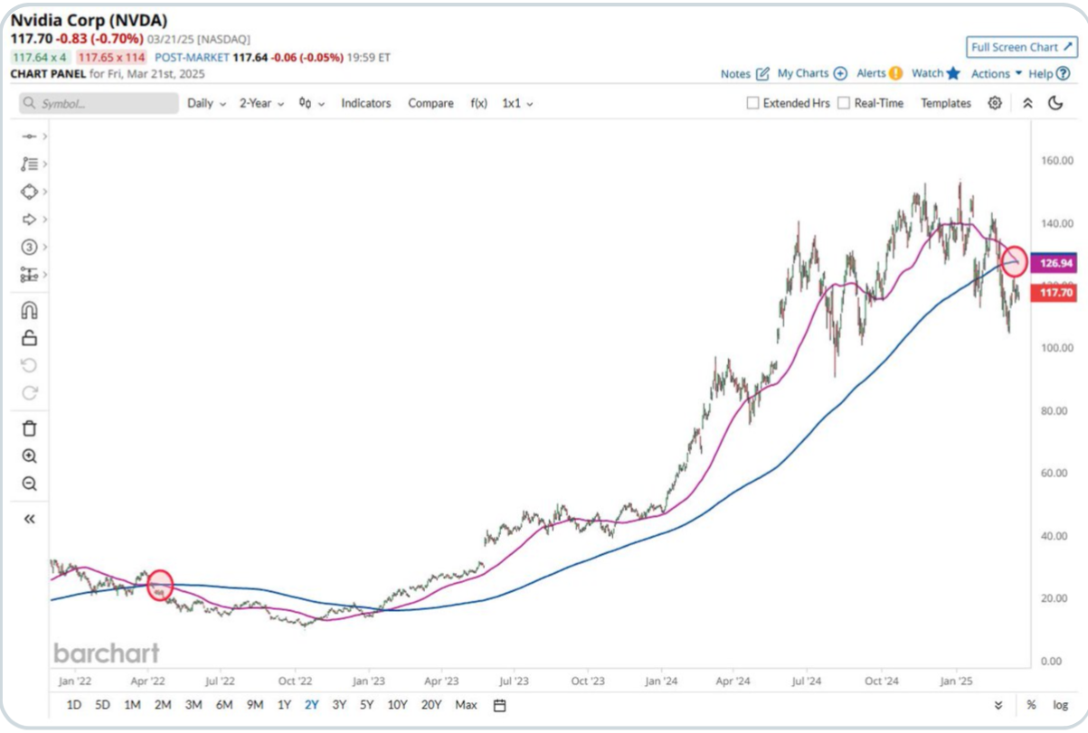 Finansal veri platformu Barchart, 23 Mart tarihli bir X (Twitter) paylaşımında, “NVDA, Nisan 2022’den bu yana ilk kez Death Cross oluşturdu. Son gerçekleştiğinde, hisse fiyatı altı ayda %47 düştü” ifadelerini kullandı.