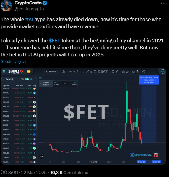 Bazı analistler, AI hype’ının artık sönmeye başladığını ve yalnızca gerçek kullanım alanı sunan projelerin uzun vadede ayakta kalacağını düşünüyor. Kripto yatırımcısı CryptoCosta, 22 Mart tarihli X (Twitter) paylaşımında şu ifadeleri kullandı: