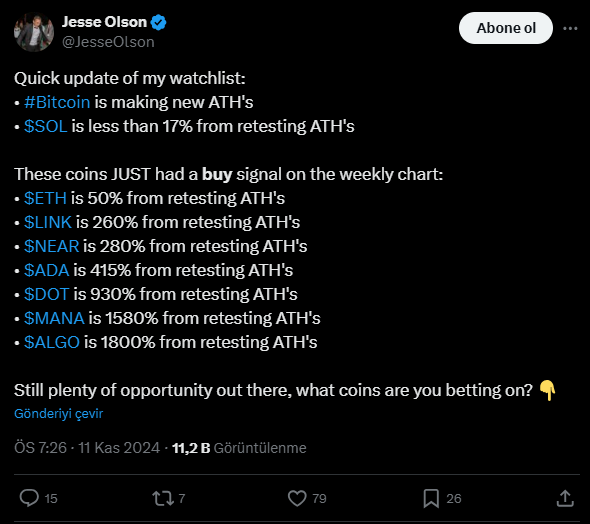 Diğer yandan analist MANA, ALGO gibi kripto paralara da dikkat çekiyor. Bu altcoinlerin yakın vadede karşılaşabilecekleri zorluklara rağmen, Olson ve diğer analistler yılın geri kalanı için olumlu bir bakış açısını sürdürüyor. Donald Trump’ın başkanlık seçimindeki zaferinin, kurumsal yatırımcıların kripto para piyasasına ilgisini artırması ve piyasaya sermaye girişlerini desteklemesi bekleniyor. Kimine göre bu siyasi değişim, ekosistemin lider kripto varlıkları olan Bitcoin ve Olson’ın izleme listesindeki altcoinlerde devam eden değer kazanımı için elverişli bir ortam yaratabilir.