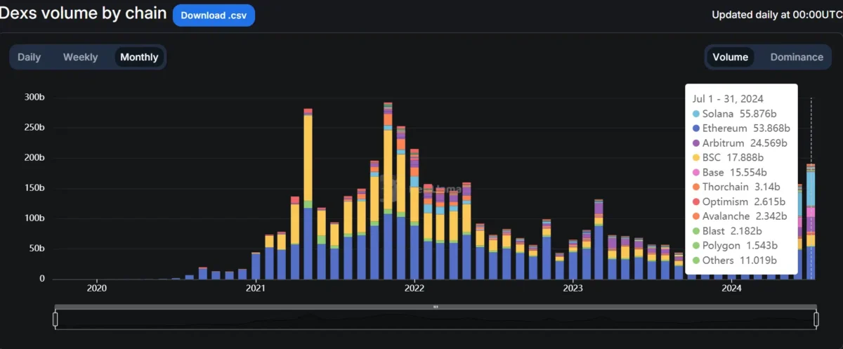 DefiLlama’ya göre Solana DEX hacmi Temmuz ayında 55,8 milyar dolara ulaşarak 1 Temmuz – 31 Temmuz tarihleri arasında Ethereum’daki on-chain alım satım faaliyetlerini geride bıraktı. Merkezi olmayan finans (DeFi) için en büyük Blockchain olan Ethereum, aynı dönemde 53,8 milyar dolar kaydetti. Arbitrum ve Base gibi Layer-2 ağları ve L1 Blockchain Binance Smart Chain, Solana ve Ethereum’dan sonra en fazla hacmi oluşturdu.