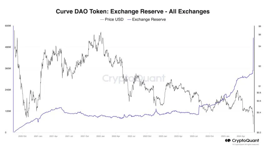 CRV’nin düşen fiyatı, pazardaki diğer büyük oyuncuları da etkiledi. Örneğin 0xF07 adlı kripto balinası, Fraxlend’deki tasfiye nedeniyle yaklaşık 7,68 milyon dolar değerindeki 29,62 milyon CRV’yi Binance’e devretmek zorunda kaldı. Bununla birlikte, başka bir onchain analiz platformu olan CryptoQuant’ın kurucusu Ki Young Ju, borsalardaki CRV bakiyesinde önemli bir artış gözlemleyerek tüm zamanların en yüksek seviyesine ulaştı. Sadece dört saat içinde %57 arttı.