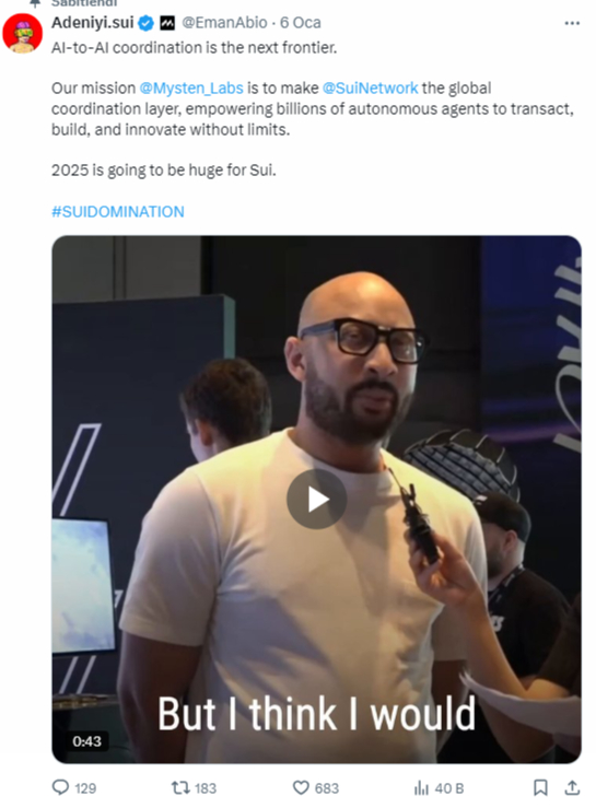 Kriptokoin.com’dan takip ettiğiniz üzere, yapay zeka anlatısı kripto dünyasında rüzgarlar yaratmaya devam ediyor. X’te yayınlanan bir gönderide Abiodun, neden “yapay zekâlar arası koordinasyonun bir sonraki sınır olduğuna” inandığını açıklayan bir video paylaştı. Bu bağlamda altcoin Sui’nin kurucusu, şu açıklamayı yaptı: