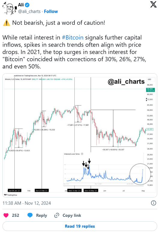 Bitcoin’in son zamanlarda 90 bin dolara yaklaşan yükselişi piyasada olumlu bir hava yarattı, ancak ardından gelen %4’lük düşüş, kripto piyasasında endişeye yol açtı. Şu anda birçok analist, Bitcoin’e olan bireysel ilginin zirve yapmasıyla birlikte olası bir fiyat düzeltmesi konusunda uyarıda bulunuyor. Öne çıkan grafik analisti Ali Martinez, geçmişte Bitcoin’e olan yoğun aramaların genellikle %30 ila %50 arasında düzeltmelere yol açtığına dikkat çekerek yatırımcılara ihtiyatlı olmalarını hatırlattı. Buna ek olarak, son raporlar, Bitcoin’in tarihsel örüntüler ve mevcut piyasa trendlerine göre yakında bir geri çekilme yaşayabileceğini öne sürüyor. İşte kritik Bitcoin tahmini