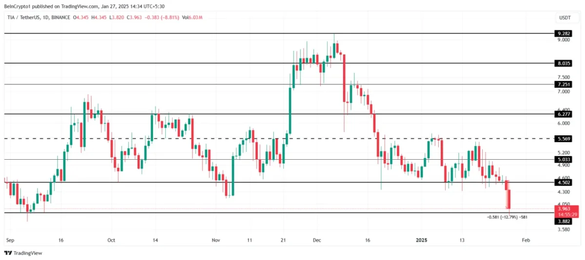 Celestia (TIA), son 24 saatte %12 oranında düşüş yaşayarak 3.96 dolar seviyesine geriledi. Ancak bu düşüşe rağmen 3.88 destek seviyesinin üzerinde kalmayı başardı. Bu kritik destek, altcoinin daha fazla değer kaybını önleyebilmesi adına oldukça önemli.