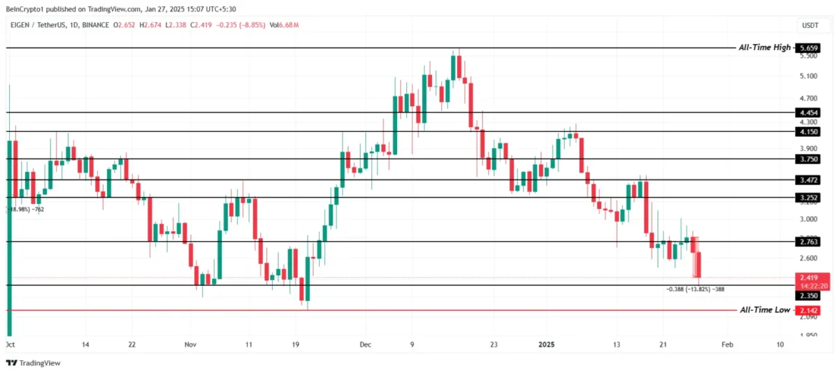 EigenLayer (EIGEN), son bir gün içinde %14’e yakın bir düşüşle 2.41 seviyesine geriledi. Bu düşüşe rağmen, altcoin 2.35 destek seviyesinin üzerinde kalmayı başardı. Ancak piyasanın dalgalı seyrine bağlı olarak bu destek seviyesinin sürdürülebilirliği dikkatle takip edilmelidir.