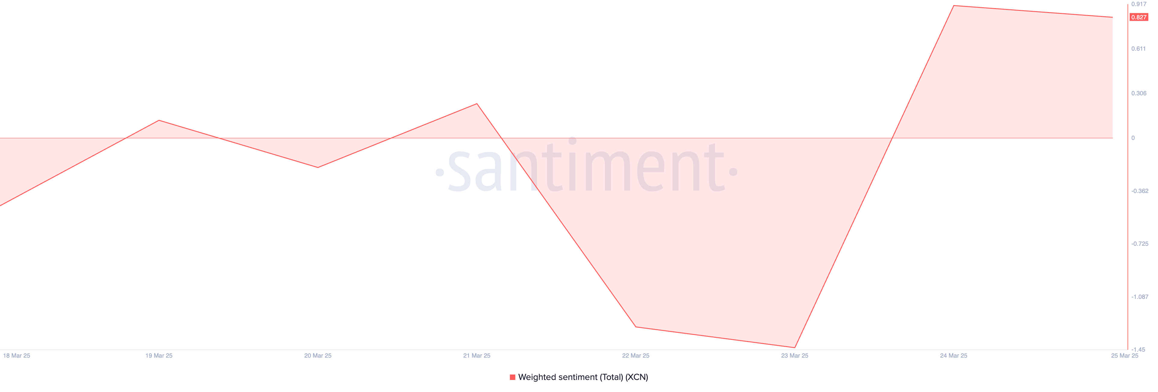 Bunun yanı sıra, XCN’nin ağırlıklı piyasa duyarlılığı göstergesi de 0.82 seviyesine yükselmiş durumda. Bu metrik, sosyal medyada yapılan paylaşımların hacmi ve içerdiği duygusal tonu analiz ederek yatırımcıların genel eğilimini belirler. Pozitif bir değer, yatırımcı güveninin arttığını ve alım yönlü işlemlerin yükseliş gösterebileceğini işaret eder.