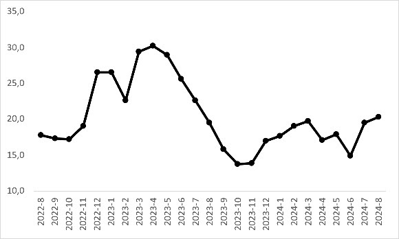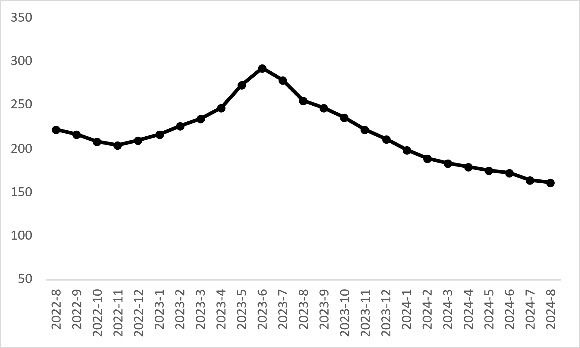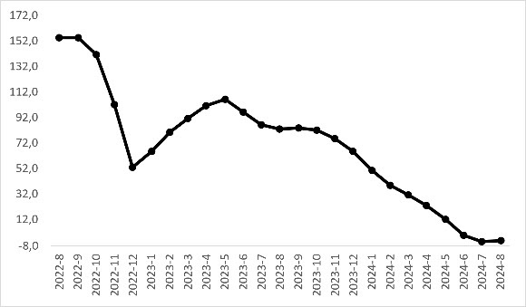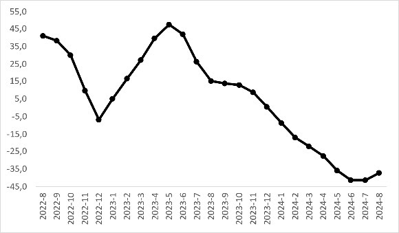 Enflasyondan arındırıldığında otomobil ortalama reel fiyatının 14 aydır düştüğü görülüyor (Şekil 1-Üst panel). Reel fiyat endeksi Temmuz’a kıyasla yüzde 2,1 azalarak 161,4 oldu. Reel fiyatlardaki yıllık değişimin de hala negatif olduğu gözlemleniyor (Şekil 2-Alt panel). 2023 Mayıs’ta yüzde 47,9’a ulaşan değişim oranı takip eden aylarda sürekli azalarak 2024 Temmuz’da yüzde -41,1’e geriledi. Reel fiyatlardaki yıllık değişim oranı Ağustos’ta bir miktar yükselerek yüzde -37 oldu.