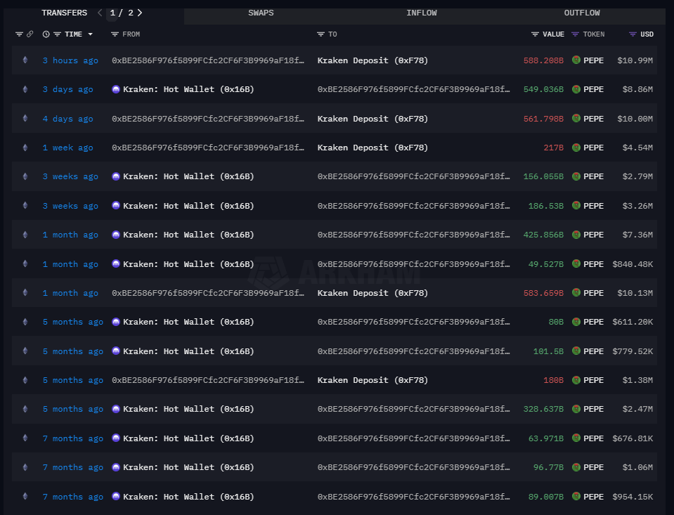 Data Nerd’e göre, 0xBE2 cüzdan adresine sahip bir kripto balinası Kraken’e 10,99 milyon dolara eşdeğer 588B PEPE token yatırdı. Şimdilik, Pepe Coin balinası holdingi popüler kripto borsasına yatırdı ve olası satışlar ve bunların fiyat üzerindeki sonuçları hakkında soruları gündeme getirdi. İlginç bir şekilde, balina bu kriptoları yedi ay boyunca elinde tuttu ve bunları 5,2 milyon dolar karşılığında biriktirdi. Yüksek sabırla, balina şu anda 7,34 milyon dolarlık gerçekleşmemiş kâra sahip ve mevcut PEPE fiyatı 0,00001849 dolar. Bununla birlikte, balina %141’lik bir yatırım getirisi elde etti.