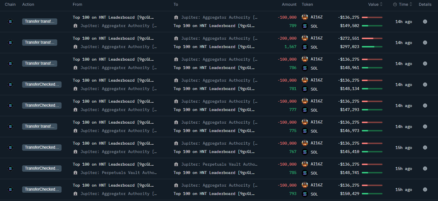 16 Ocak tarihinde kripto para piyasasında balinaların gerçekleştirdiği dikkat çekici işlemler gözlendi. OnchainLens verilerine göre, bir balina tüm AI16Z varlıklarını satarak 4.04 milyon dolarlık kâr elde etti. Söz konusu balina, 2-8 Aralık 2024 tarihleri arasında 7,745 SOL (o zamanki değeriyle 1.58 milyon dolar) ve 1.87 milyon USDC yatırarak toplam 6.35 milyon AI16Z biriktirmişti. Daha sonra tüm AI16Z’leri satarak 38,053 SOL (o zamanki değeriyle 7.46 milyon dolar) ve 29,546 USDC’ye dönüştürerek toplamda 4.04 milyon dolar kâr sağladı.