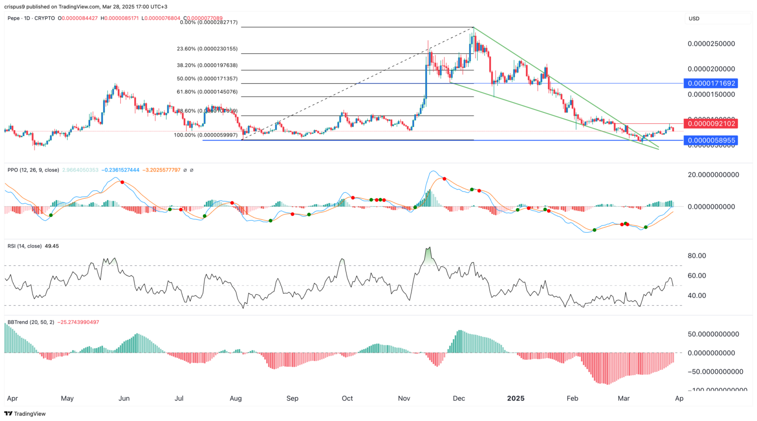 Düşen Takoz Formasyonu: PepeCoin ayrıca bir düşen takoz formasyonu oluşturdu. Bu formasyon, bir varlığın alçalan ve yakınlaşan bir kanal içinde konsolide olmasıyla meydana gelir. Genellikle, iki çizgi birleştiğinde yukarı yönlü bir kırılma gerçekleşir. PepeCoin için bu birleşim noktası, çift dip formasyonunun alt kısmında bulunuyor.