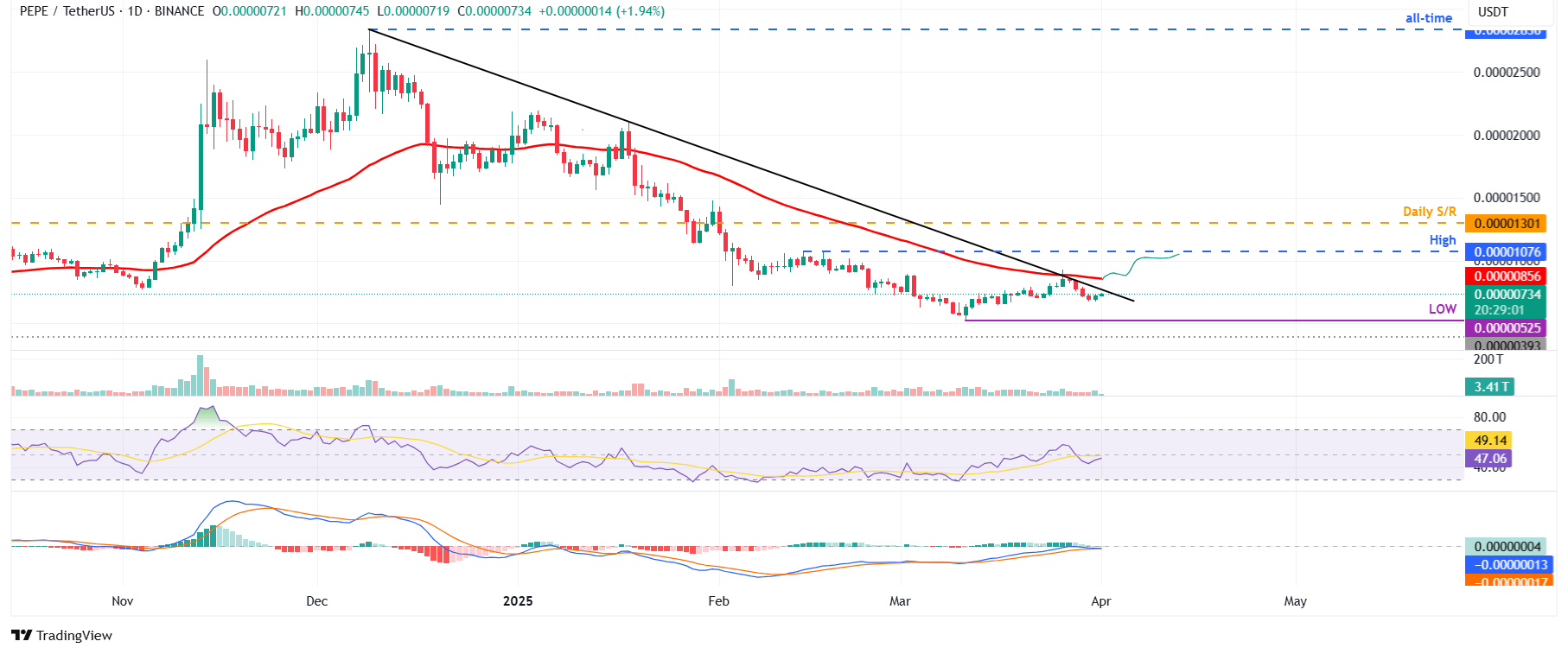 Pepe’nin fiyatı 27 Mart’ta alçalan trend çizgisi etrafında bir retle karşılaştı ve Pazar gününe kadar %18,43 geriledi. Bu trend çizgisi kabaca 50 günlük EMA ile 0,000008 dolar civarında çakışıyor. Bu da onu önemli bir direnç bölgesi ve boğaların lehine bir kırılma haline getiriyor. Ancak, Pazartesi günü, bu haftanın başında, yaklaşık %4 oranında toparlandı. Popüler meme coin’i Salı günü yazı sırasında, azalan trend çizgisine yaklaşıyor.