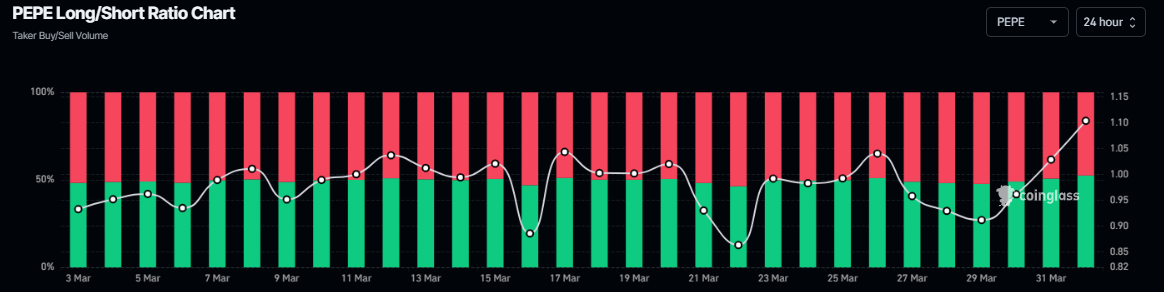 PEPE’nin yükseliş görünümünü destekleyen bir diğer tez de Coinglass’ın long-short oranı. Meme coin için veriler, bir ayın en yüksek seviyesi olan 1,01’i gösteriyor. Birin üzerindeki bu oran, daha fazla traderın meme coin fiyatının yükselmesi için pozisyon alması nedeniyle piyasalardaki yükseliş eğilimini yansıtıyor.