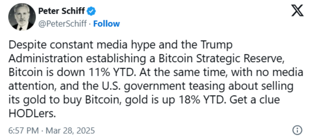 Peter Schiff, risk toleransı sorularını son piyasa performansına bağlayarak, Bitcoin’i altınla olumsuz bir şekilde karşılaştırdığı önceki açıklamalarını yineledi. O dönemde Bitcoin’in yılbaşından bugüne %11 gerilediğini, altının ise 2025’te aynı dönemde %18 değer kazandığını belirtti. Schiff bu eşitsizliği, Bitcoin’e yönelik yersiz ‘yatırımcı iştahı’ olarak gördüğü durumu eleştirmek için kullandı.