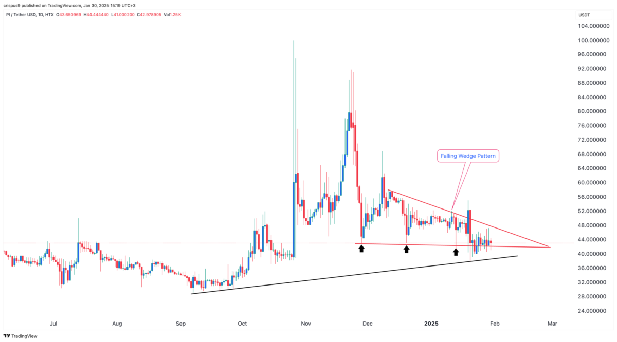 Şu anda 43 dolardan işlem gören Pi Network, kritik bir yükseliş trend çizgisinin hemen üzerinde bulunuyor. Grafikte görülen çift dip formasyonu ve düşen takoz formasyonu, yükselişin sinyallerini veriyor. Eğer ana ağ yarın açılırsa, büyük bir “God Candle” oluşabilir ve fiyat 100 dolara kadar sıçrayabilir.