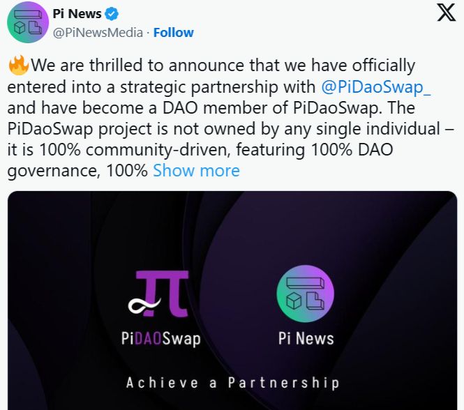 Görünürde bu fiyat düşüşünün net bir sonu yok. Bununla birlikte, Pi News (projenin arkasındaki resmi medya kaynağı) dün büyük bir ortaklık duyurdu. Bu da günlük ölçekte %7’lik artışın arkasındaki neden oldu. İşbirliği, tek bir bireye ait olmayan “%100 topluluk güdümlü” bir proje olan PiDaoSwap ile yapıldı. Gönderide, “%100 DAO yönetişimi, %100 şeffaflık ve tam merkeziyetsizlik” özelliklerine sahip olduğu belirtildi.