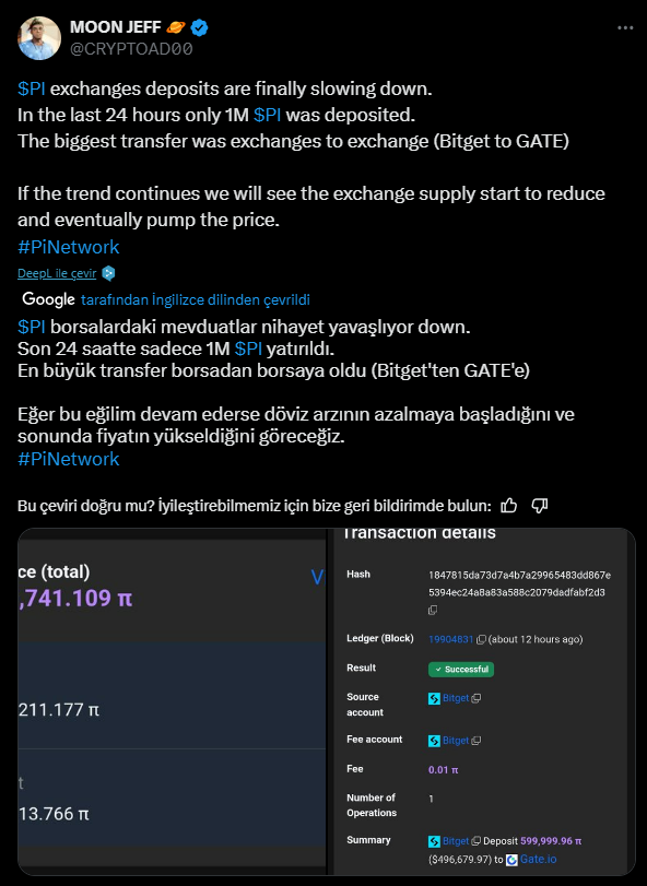 Toplulukta bazı kullanıcılar, PI fiyatının kısa vadede 1,2 dolar seviyesine ulaşabileceğini savunurken, artan işlem hacminin de yükselişi desteklediğine dikkat çekiliyor. Ayrıca PI token’ların borsalara transferinde ciddi bir yavaşlama yaşanması, satış baskısının azaldığını gösteriyor. Geçtiğimiz ay boyunca 300 milyon adetten fazla PI token borsalara aktarılmıştı. Ancak şu anda bu rakam yaklaşık 1 milyon seviyelerine geriledi.