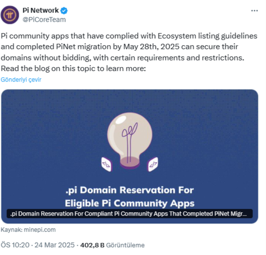 İkincisi doğrudan projenin resmi X kanalından geldi. Ekosistemin listeleme yönergelerine uyan ve bu yıl 28 Mayıs’a kadar PiNet geçişini tamamlayan Pi topluluk uygulamalarının “belirli gereksinimler ve kısıtlamalarla alan adlarını teklif vermeden alabilecekleri” bildirildi. Ekip, bazı geliştiricilerin ilk PiNet geçiş fırsatını kaçırması nedeniyle ek sürenin 28 Mayıs’a kadar uzatıldığını da sözlerine ekledi.