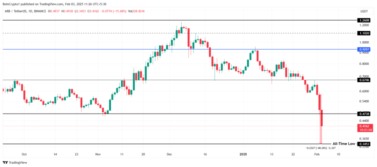 Arbitrum, son 24 saatte %40 değer kaybederek 0,345 dolara düştü ve yeni bir dip seviyesine ulaştı. Piyasadaki belirsizlik, altcoinin istikrarına dair endişeleri artırdı.