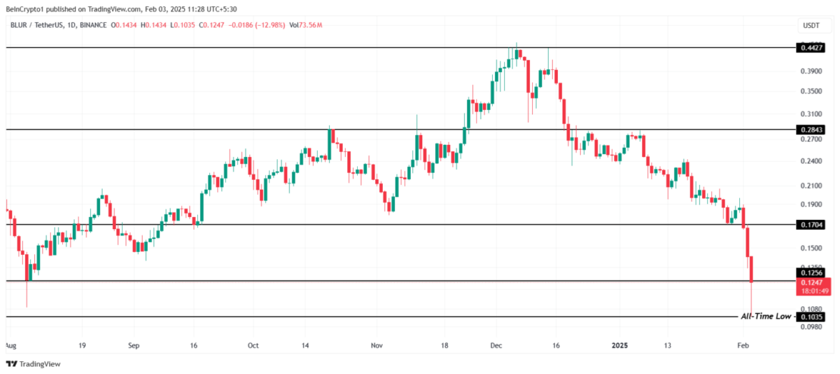 BLUR, son 24 saatte %26 düşerek 0,103 dolara kadar geriledi ve tüm zamanların en düşük seviyesini gördü. Bu düşüş, yatırımcı güvenini zedeledi ve altcoinin daha fazla değer kaybedebileceği yönünde endişelere yol açtı.