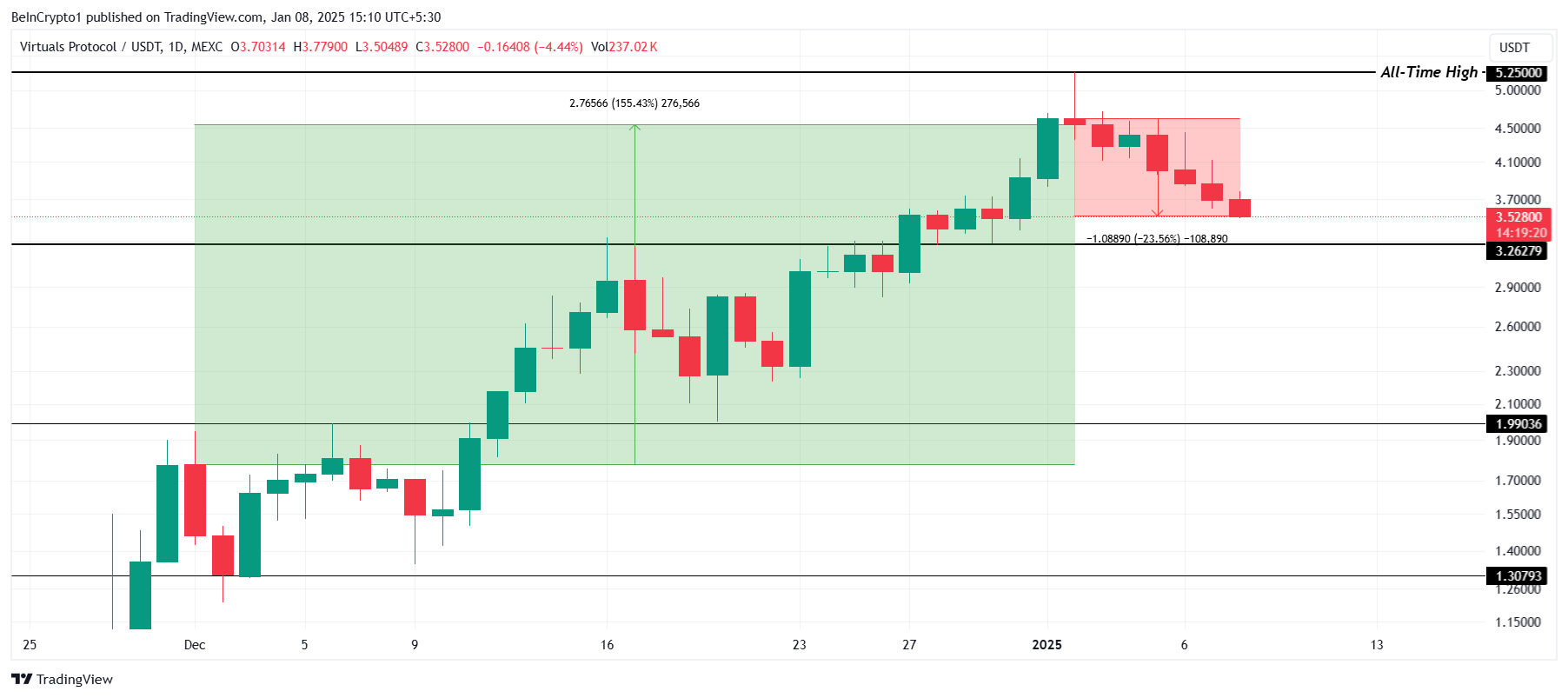 Şu anda 3,26 doların üzerinde seyreden VIRTUAL, yatırımcıların satış dürtüsüne direnmesi koşuluyla toparlanma fırsatına sahip. Bununla birlikte, 3,26 doların altındaki bir ihlal, toparlanma şansını geçersiz hale getirir. Bunun da altcoini daha fazla düşüşe karşı savunmasız bırakması mümkün.