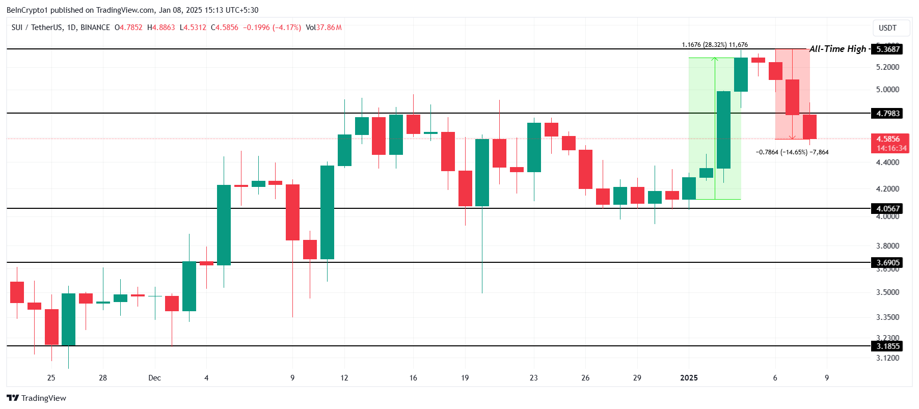SUI’nin fiyatı, VIRTUAL’ın gidişatını yansıtarak 5,36 dolar ile ATH seviyesine ulaştı. Ancak, daha sonra 72 saat içinde %14,6’lık bir düşüş kaydetti. Ani düşüş, piyasada artan satış baskısının altını çizdi. SUI’nin 4,79 dolarlık destek seviyesini geçerek 4,58 dolardan işlem görmeye başlamasıyla yılbaşından bu yana elde edilen %28’lik kazanç kısmen tersine döndü. 4,05 dolarlık destekten sıçrama daha fazla kayıp yaşanmasını engelledi. Ancak yatırımcılar temkinli davranmaya devam ediyor.