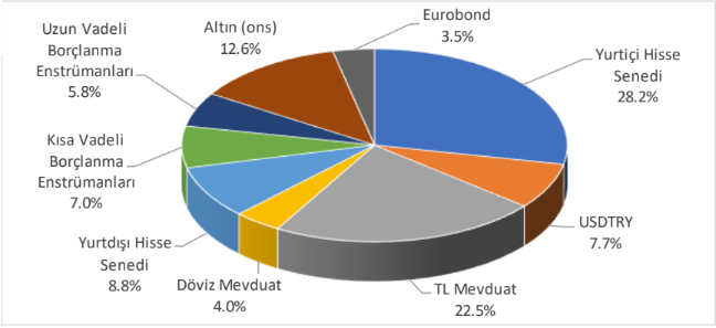 Piyasa Profesyonelleri Anketi’nin portföy dağılımı sorusuna verilen yanıtlara göre piyasanın çoğunun portföy tercihlerinde hisse senedi yine en çok paya sahip varlık sınıfı olurken portföydeki ağırlığı %27.5’ten %28.2’ye yükseldi. Altının ağırlığı ise 2.9 puan artışla %12.6’ya yükseldi. Kısa ve uzun vadeli yurtiçi borçlanma araçlarının payları sırayla 0.23 ve 0.36 puan artışla %7.0 ve %5.8’e yükselirken diğer varlık sınıflarının payı önceki aya göre düşüş gösterdi. Payı en çok düşen varlık sınıfı ise 1.34 puan düşüşle %22.5’e gerileyen TL mevduat oldu.