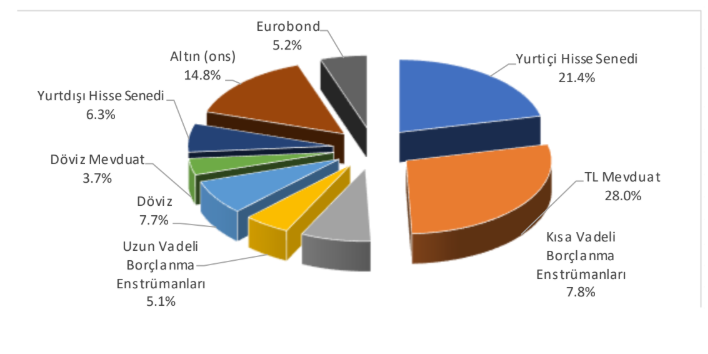 Piyasa Profesyonelleri Anketi’nin portföy dağılımı sorusuna verilen yanıtlara göre Mart ayında piyasa profesyonelleri portföylerinde TL mevduat, döviz, DTH, altın ve eurobondun ağırlığını önceki aya göre yüksetti. En yüksek artış 8.3 puan ile ağırlığı %19.7’den %28.0’e yükselen TL mevduatta görüldü; hisse senedinin ağırlığı 7.7 puan düşüşle %29.1’den %21.4’e geriledi. Yurtdışı hisse senedinin payı da 3.0 puan azalarak %6.3’e indi. İkinci sıraya altın yerleşirken ağırlığı 0.3 puan artışla %14.8’e yükseldı. Böylece TL bazlı varlıkların portföy içindeki toplam ağırlığı Şubat’taki yaklaşık %63.0’ten Mart’ta %62.3’e gerilerken döviz bazlı varlıkların ağırlığı artış kaydetti.