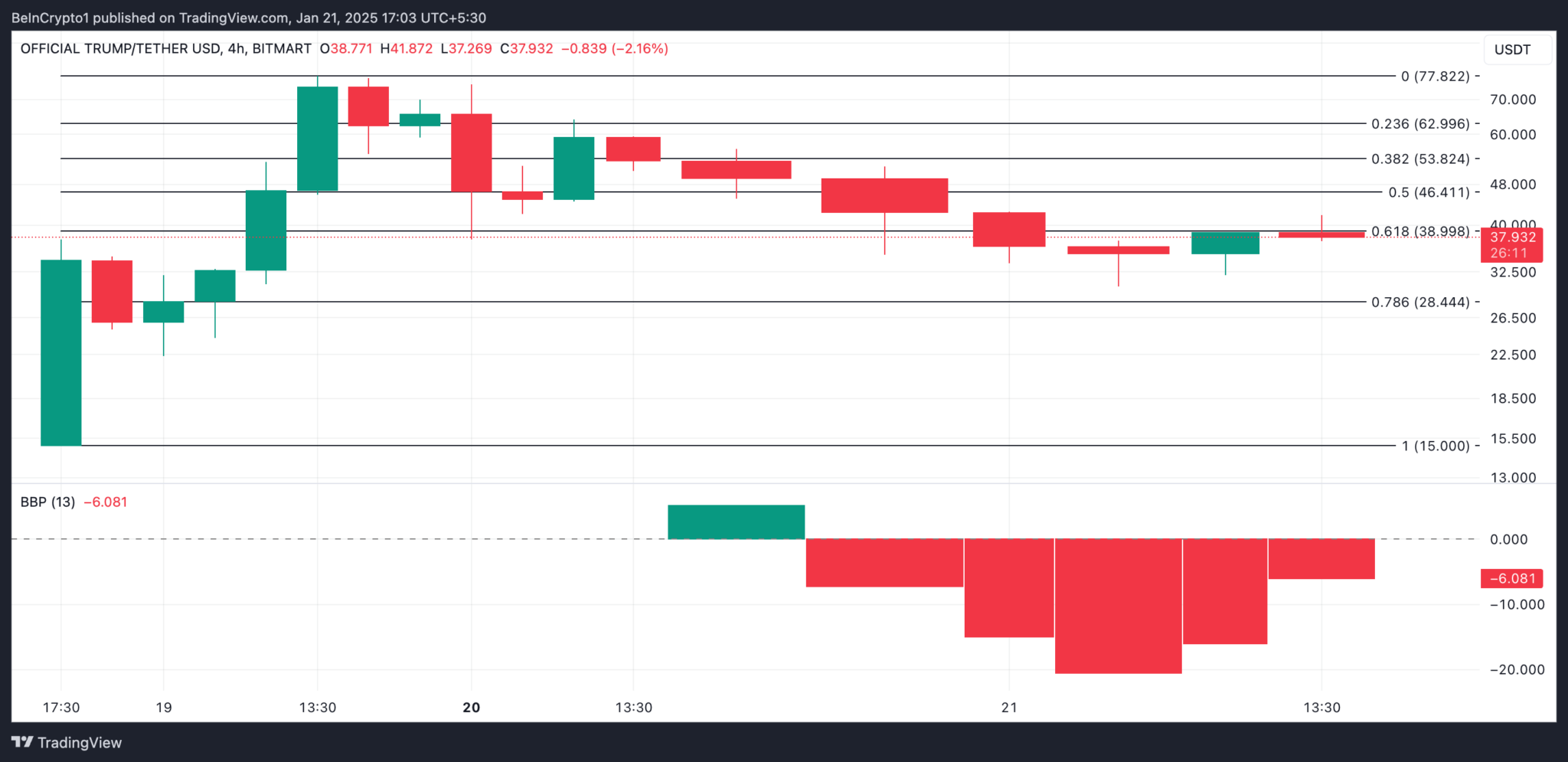 Donald Trump’ın meme tokeni TRUMP Coin, son 24 saat içinde değerinde yaşanan önemli düşüş nedeniyle bugün trend oluyor. Basın saatine göre, Solana merkezli meme coin 37,93 dolardan işlem görüyor. Token bu süre zarfında değerinin %27’sini kaybetti. TRUMP Coin, 19 Ocak’ta tüm zamanların en yüksek seviyesi olan 77,82 dolara tırmandı. Ancak, o zamandan bu yana artan satışlar nedeniyle fiyatı %50’nin üzerinde düştü.
