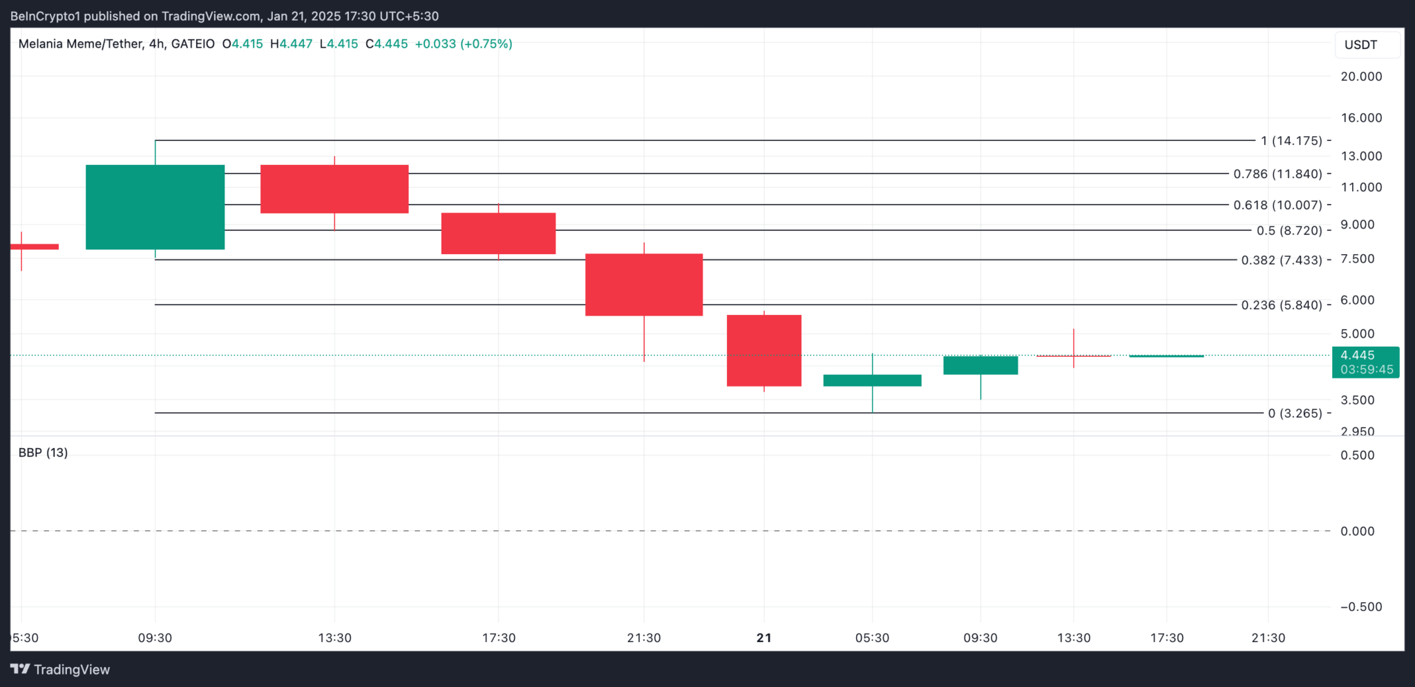 Yeni piyasaya sürülen MELANIA’nın değeri son 24 saat içinde %58 oranında düşerek bugün trend olan coinlerden biri haline geldi. MELANIA, Pazartesi günkü işlem seansında tüm zamanların en yüksek seviyesi olan 14,17 dolara tırmandı. Ancak, o zamandan beri %71 oranında düştü. Bu yazı itibariyle, meme coin 4,45 dolardan işlem görüyor. Donald Trump’ın göreve başlamasının ardından meme coinlere yönelik ilginin azalmasıyla birlikte MELANIA düşüşünü sürdürmeye hazır görünüyor. Böyle devam ederse fiyatı 3,26 dolara kadar düşebilir. Bununla birlikte, birikimde bir canlanmaya tanık olursa, MELANIA toparlanabilir ve 5,84 dolara doğru yükselebilir.
