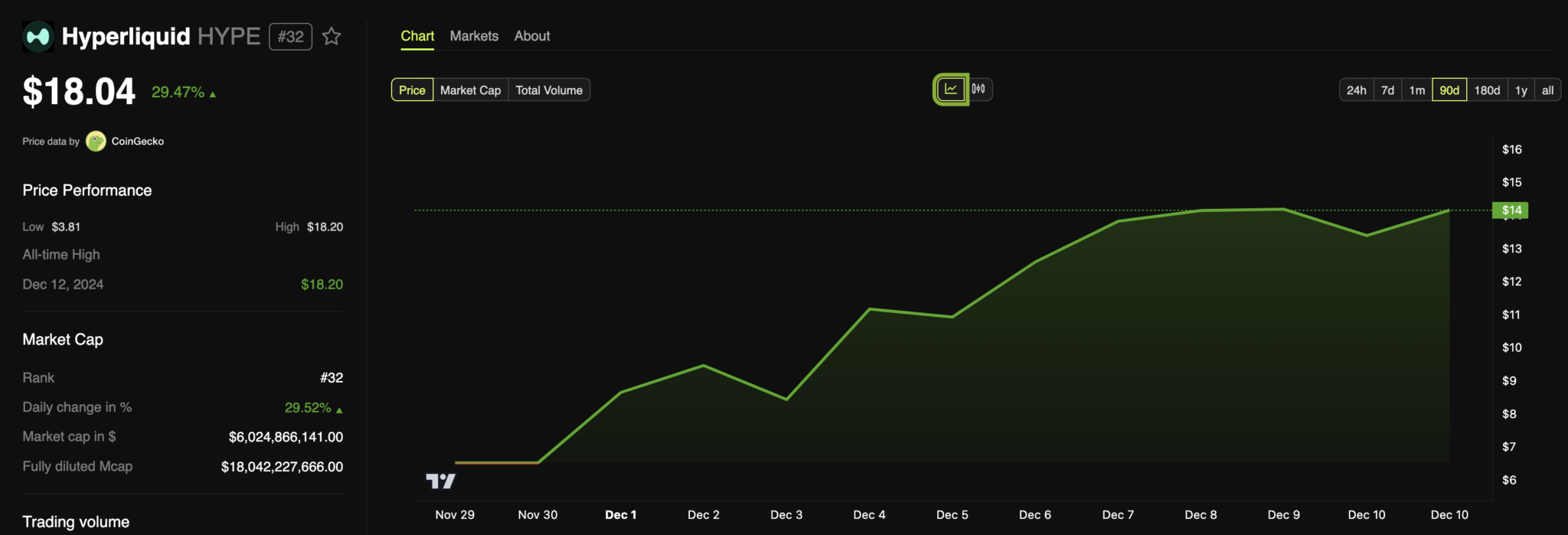 Hyperliquid’in trend bir altcoin olarak konumu aktif piyasa katılımcılarını şaşırtmıyor. Birkaç hafta önce piyasaya adım attı. Ancak HYPE, herhangi bir borsa listelemesi olmamasına rağmen birçok kriptodan daha iyi performans gösterdi. Spesifik olarak, HYPE’nin değeri o dönemden bu yana %464,50 arttı. Dahası, bunun %30’u son 24 saat içinde gerçekleşti. Bu dönemdeki işlem hacmi de 230 milyon doların üzerine çıktı. Bu da on-chain etkileşimin son derece etkileyici bir yükseklikte kaldığını gösterdi. Bu eğilim aynı kalırsa, HYPE’ın kısa vadede 18 doların üzerine çıkması mümkün. Ancak, altcoin holderları varlıklarının bir kısmını tasfiye etmeye karar verirse, token’ın düşmesi olası.