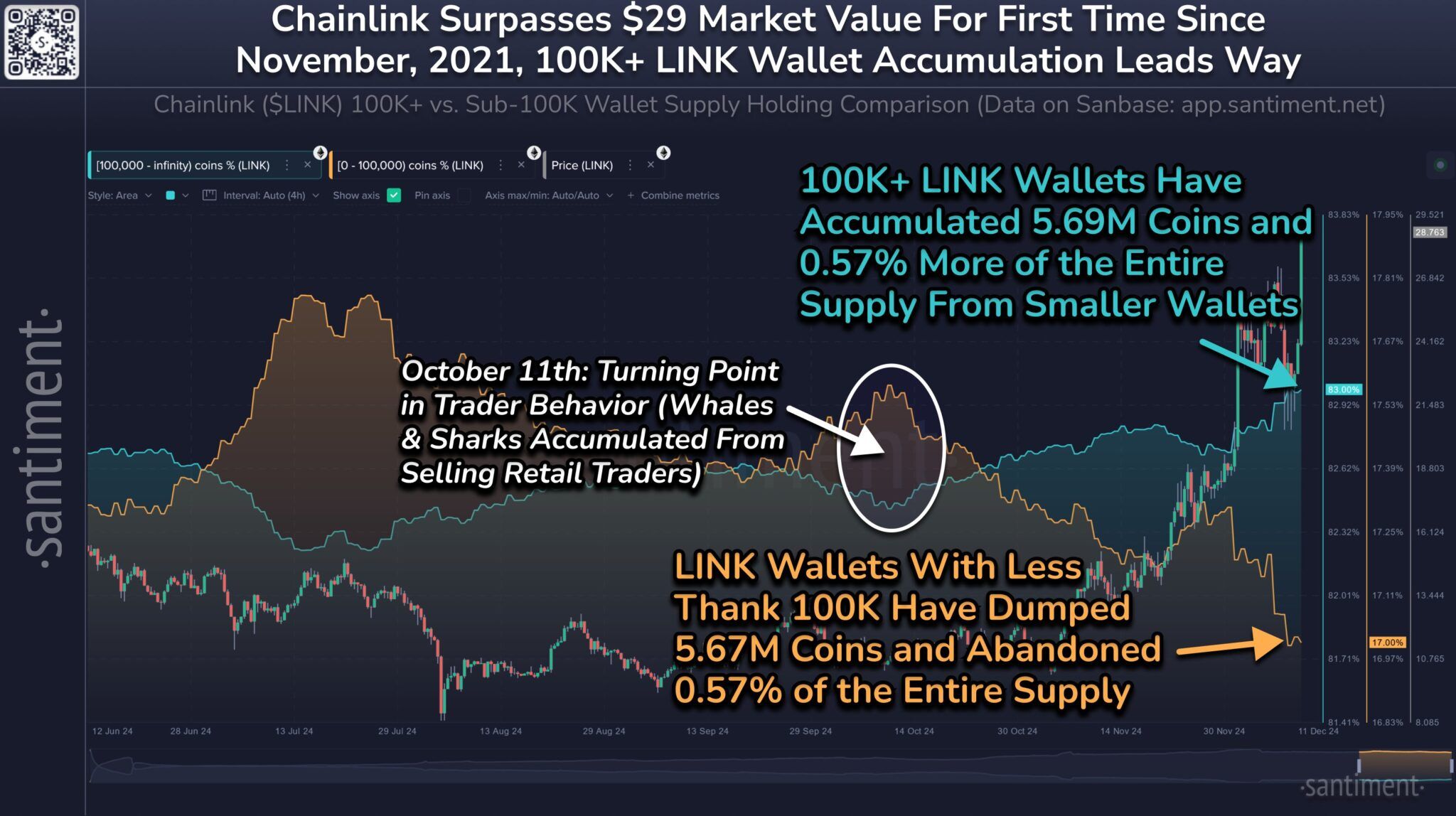 LINK Coin fiyatı da güçlü arttı. Özellikle, altcoin’in değeri yaklaşık 37 ay içinde en yüksek seviyesine ulaştı. Ancak Chainlink’in trend altcoinler arasında yer almasının tek nedeni bu değil. Donald Trump’ın World Liberty Finance’i 11 Aralık’ta 1 milyon dolar değerinde LINK satın aldı. Ancak, altcoin’i rakamlarla biriktiren tek kişi Trump ekibi değil. Ayrıca Santiment’in verileri, yaklaşık 100.000 LINK tutan cüzdanların son iki ayda 5,67 milyon eklediğini ortaya koydu. Bu balina birikimi devam ederse, LINK Coin fiyatının daha da yükselmesi mümkün.