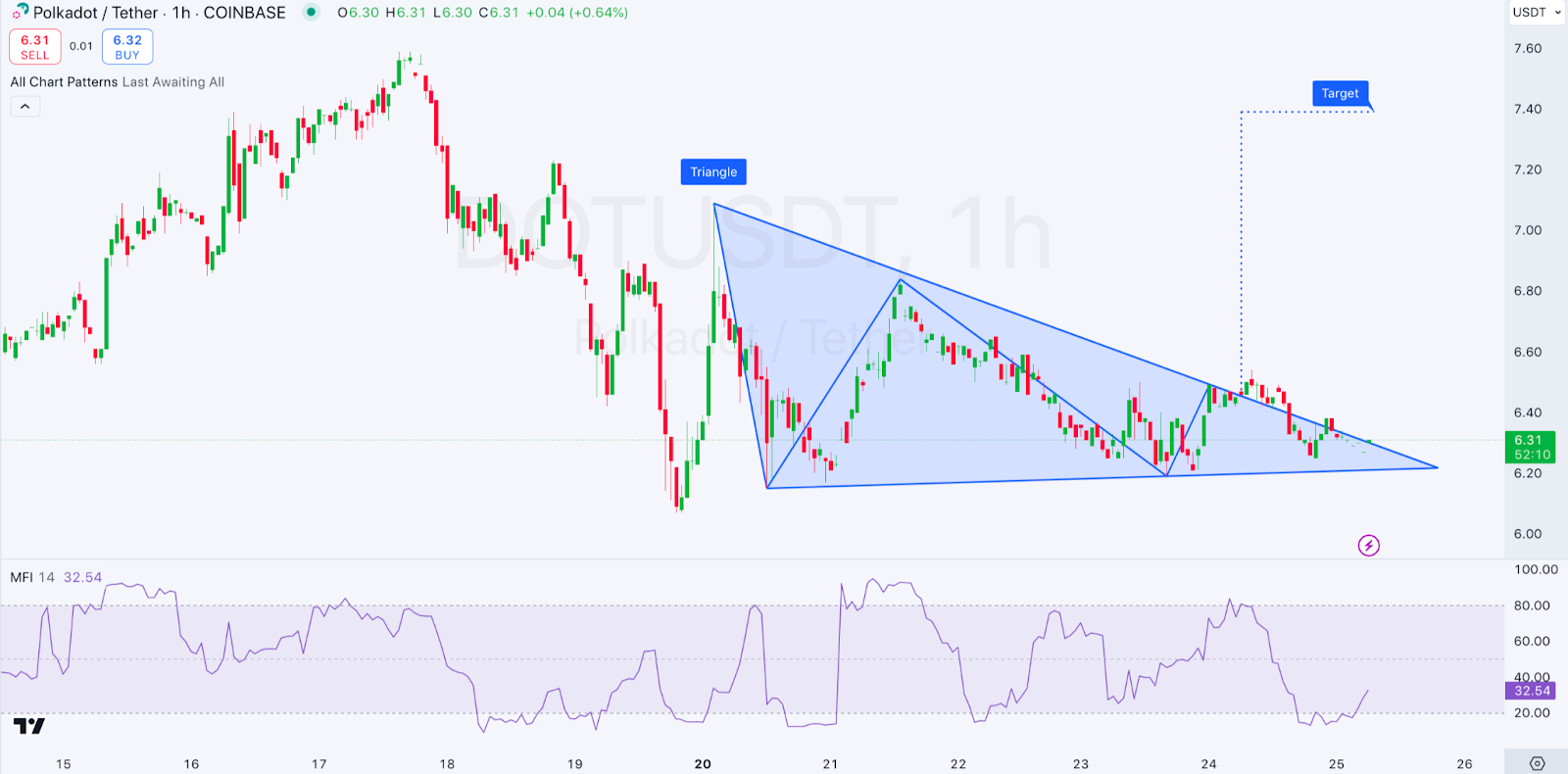 -1 saatlik DOT/USDT grafiğinde ise simetrik bir üçgen formasyonu görülüyor. Bu, fiyatın bir süre konsolide olduğunu ve büyük bir kırılımın yaklaştığını gösteriyor. Bu kırılımın yönü, piyasa momentumuna bağlı olacak.