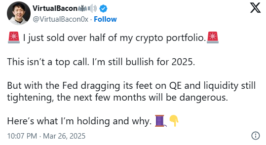 Sosyal medyada geniş takipçi kitlesine sahip bir analist olan VirtualBacon’a göre kripto para piyasasını zorlu bir süreç bekliyor olabilir. Analist, yakın tarihli bir sosyal medya paylaşımında, kripto portföyünü neredeyse yarı yarıya azalttığını açıkladı. Sebebi mi? Piyasada kısa vadeli türbülans yaratabileceğine inandığı ABD Merkez Bankası’nın likiditeyi sıkılaştırmaya devam etmesine ilişkin endişeler.