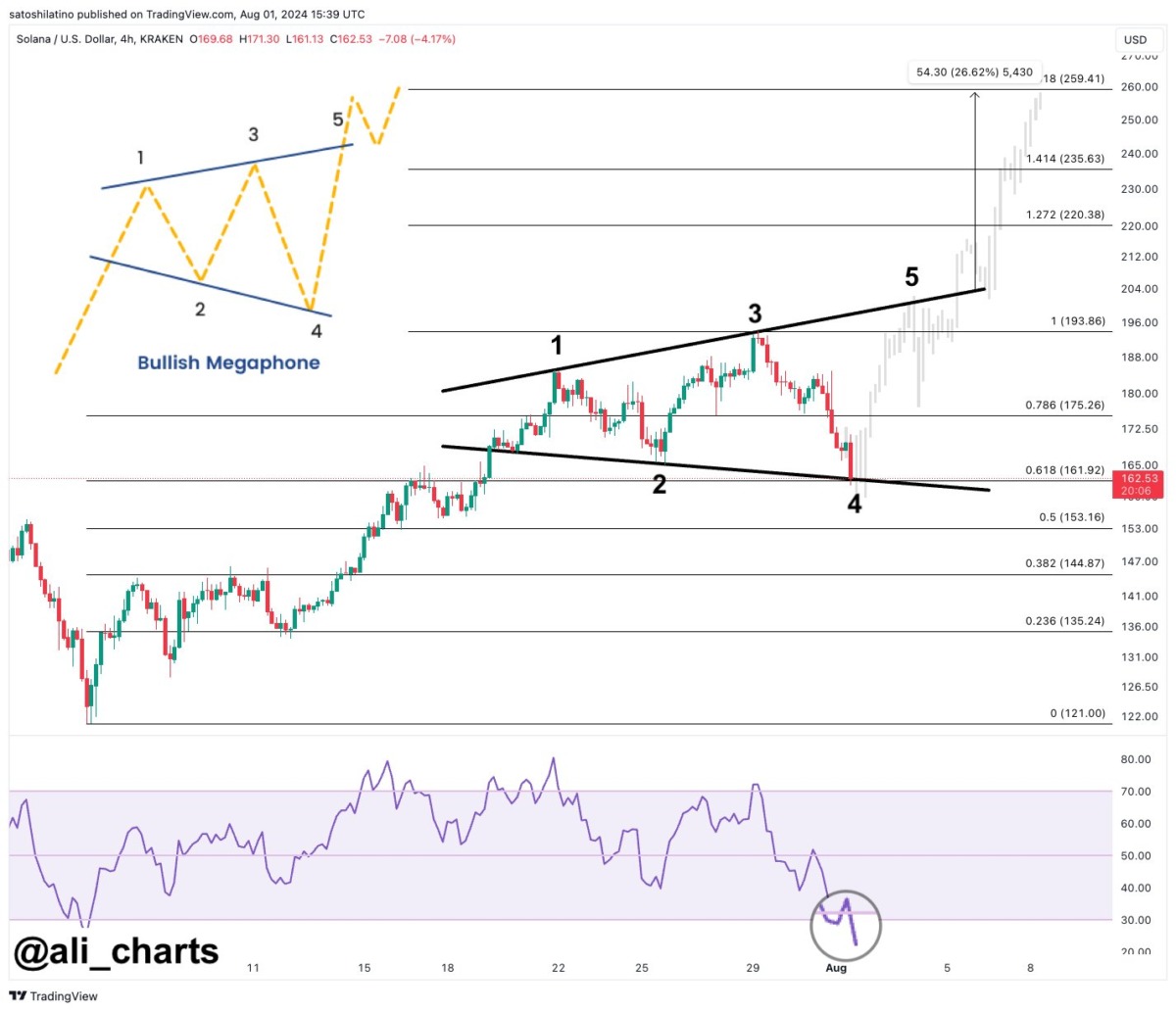 Kriptokoin.com’dan takip ettiğiniz üzere, piyasa sert satışlarla ağır bir darbe aldı. Bununla birlikte, her düşüşten sonra toparlandığı gibi beklentiler bunun da üstesinden geleceği yönünde. Bu ortamda popüler analist Ali Martinez, takipçilerine son tahminlerini paylaştı. Analist, akıllı sözleşme platformu Solana’nın (SOL) dört saatlik grafiğinde, mevcut fiyatından %63’lük bir kazançla 259 dolara fırlamasını sağlayacak bir boğa modeli oluşturabileceğini söylüyor. Bu bağlamda analist, şu açıklamayı yapıyor:
