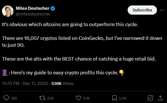 Ripple, Cardano ve Algorand gibi altcoin’ler, büyük borsalardaki geniş erişim ağı sayesinde yatırımcıların dikkatini çekiyor. İlginç bir şekilde, bu altcoinler son aylarda beklenenden daha düşük bir performans sergilemişti. Deutscher, “Bu döngüde hangi altcoinlerin öne çıkacağı çok açık. CoinGecko’da listelenen 16.057 kripto para var. Ancak ben bunu sadece 90 taneye indirdim. Bu altcoinler, büyük bir yatırımcı talebini yakalamak için en iyi şansa sahip,” diye belirtti.