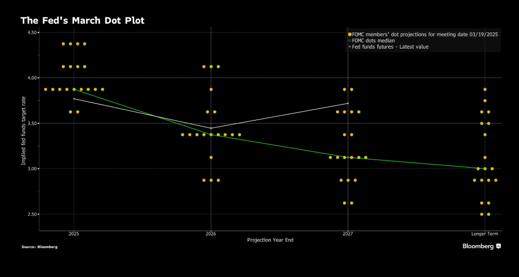 - Faiz tahminlerinin “nokta grafiği”, medyan yetkilinin 2025’te faizleri yarım puan düşürmeyi beklediğini gösteriyor, bu da Aralık ayında bekledikleri gibi bu yıl sadece iki çeyrek puanlık indirim anlamına geliyor.