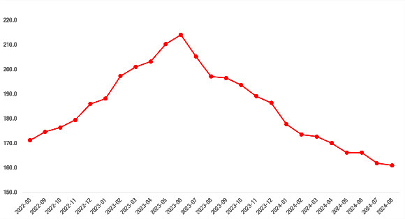 2020 Mayıs’tan itibaren sürekli artan ülke genelindeki reel konut fiyat endeksinin 2023 Temmuz’dan bu yana gösterdiği düşüş 2024 Ağustos’ta da devam etmiştir. (Şekil 1) Reel konut fiyat endeksi Ağustos’ta Temmuz’a kıyasla 0,9 puanlık bir azalışla 161 olmuştur. Temmuz’dan Ağustos’a enflasyon oranı cari konut fiyat artış oranından daha yüksek bir düzeyde gerçekleşmiştir. Son bir yıldır cari konut fiyatları sistematik olarak enflasyonun altında kaldığından reel fiyatlar azalmaktadır.