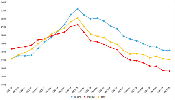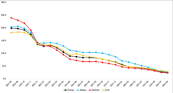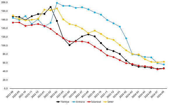 Cari fiyatların yıllık artışlarında tempo kaybı 3 büyükşehir için de geçerlidir. İstanbul’da yüzde 240,9 ile Temmuz 2022’de zirveye ulaşıldıktan sonra düşüş başlamış ve yıllık fiyat artışı Ağustos 2024’te yüzde 23’e gerilemiştir. Ankara ve İzmir’de ise zirveye Eylül 2022’de ulaşılmış, yüzde 205,6 ve yüzde 183,1 olan yıllık artış oranları, Ağustos 2024’te ise bu iki ilimizde sırasıyla, yüzde 25,5’e ve yüzde 28,6’ya gerilemiştir. (Şekil 4)