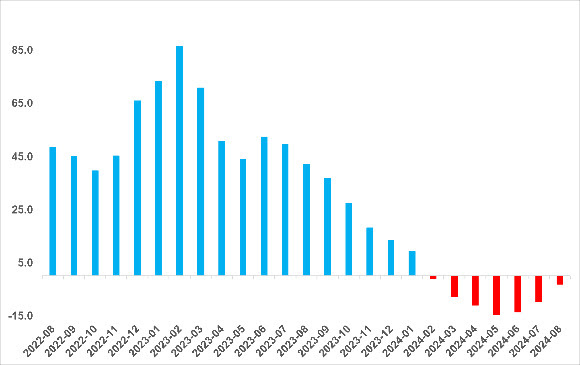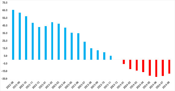 Ağustos 2022’de yüzde 65,8’e ulaşan yıllık reel fiyat artışı Eylül 2022’den itibaren hızla inişe geçmiştir. Büyük depremin etkisiyle Nisan 2023’te geçici olarak yükselen yıllık reel fiyat artışı Mayıs’tan itibaren yeniden azalmaya başlamış, bu yılın başından itibaren de reel fiyat mutlak olarak azalmaya başlamıştır. Temmuz 2024’te reel fiyatlardaki azalış hız kaybetmeye başlamıştır. Ağustos 2024’te yıllık fiyat değişimi oranı Temmuz 2024’e kıyasla 2,8 puan artsa da yüzde -18,3 ile negatif değerlerde seyrini sürdürmüştür. (Şekil 3)