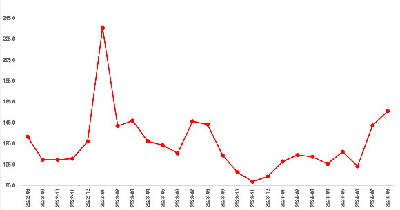 2023 Ocak’ta istisnai bir sıçrama yaparak 235’e yükselen talep endeksi, Şubat 2023 depreminin ardından düşüş yönlü bir seyir izleyerek Kasım 2023’te 88,7’ye kadar gerilemişti. Aralık 2023’ten itibaren yönünü yukarı çeviren endeks Temmuz’dan Ağustos’a yüzde 9,5’lik bir artışla 155,9’a gelmiştir. Geçen yılın Ağustos ayına kıyasla endeks yüzde 8,8 daha yüksektir.  (Şekil 5)