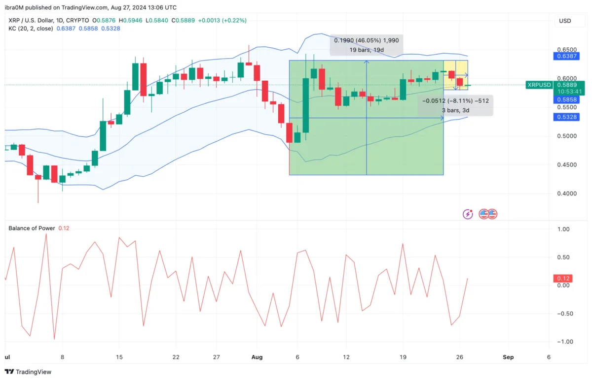 Bu arada, kripto analisti Ibrahim Ajibade, XRP’nin teknik resmini değerlendiriyor. Son geri çekilmenin ardından, XRP fiyatı kendisini çok önemli bir noktada buldu. Keltner Kanalı (KC) ve Güç Dengesi (BOP) göstergeleri XRP için karışık bir görünüm ortaya koyuyor. Acak yükseliş söylemine doğru eğiliyor. Keltner Kanalı, XRP fiyatının geçtiğimiz ay boyunca üst ve orta bantlar içinde istikrarlı bir tırmanış sürdürdüğünü ve yükseliş momentumunun devam ettiğini gösteriyor. Özellikle, XRP orta banda doğru düzeltme yaptı ve şimdi 0,59 dolar civarında acil destek görevi görüyor.