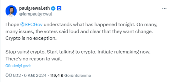 Coinbase’in Baş Hukuk Sorumlusu Paul Grewal, kripto yanlısı liderlerin harekete geçmesi halinde SEC’in etkisinin azalacağını de ima etti. Nitekim, Kongre artık kriptoyu tartışmaya daha açık. Bu yüzden, Ripple davasının ihtiyaç duyduğu ilgiyi görmesi mümkün. Garlinghouse, SEC’in bu siyasi değişimin neden gerçekleştiğini anladığını umduğunu ifade etti. Ona göre, seçmenler değişim istiyordu ve bunu elde ediyorlar.