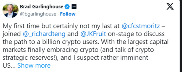 CfC St. Moritz’de ilk kez boy gösteren Ripple CEO’su Brad Garlinghouse, bir milyar kripto para kullanıcısına ulaşmanın yol haritasının tartışıldığı bir panele katıldı. Büyük piyasaların stratejik amaçlarla kripto para birimlerini benimsemeye yönelik artan ilgisine dikkat çekti. Garlinghouse, Ripple’ın XRP’si gibi ABD merkezli kripto para birimlerinin hükümet öncülüğündeki bir rezerve potansiyel entegrasyonuna atıf yaparak, “Düzenleyici çerçeveler şekillendikçe ileriye giden yol daha da netleşiyor” dedi.