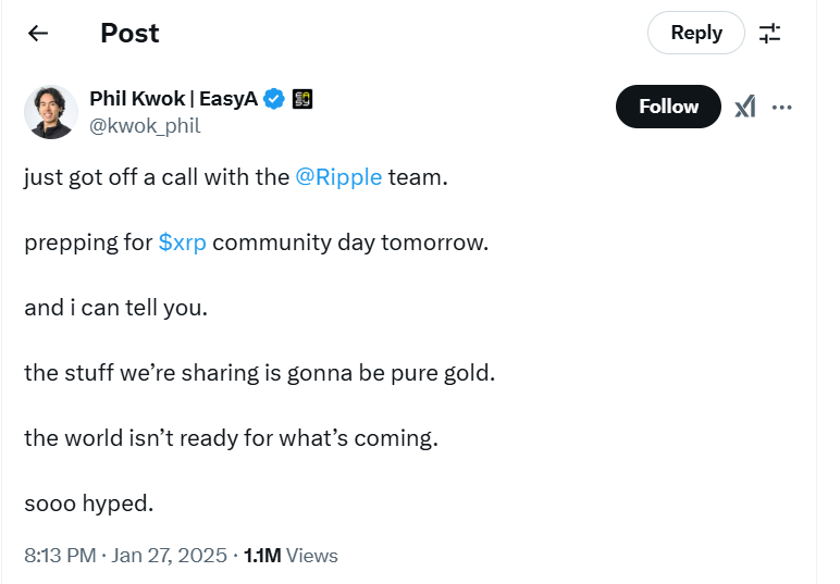 Phil Kwok yaptığı bir paylaşımda Ripple ekibiyle bir görüşme yaptığını ve XRP topluluğunu nelerin beklediği konusunda heyecanını gizleyemediğini açıkladı. Kwok’a göre, etkinlik sırasında paylaşılacak bilgiler “saf altın” olacak. Ayrıca Kwok, “dünyanın gelecek olanlara hazır olmadığını” da sözlerine ekledi. Kwok, “XRP Topluluk Günü için çok heyecanlıyım,” dedi.