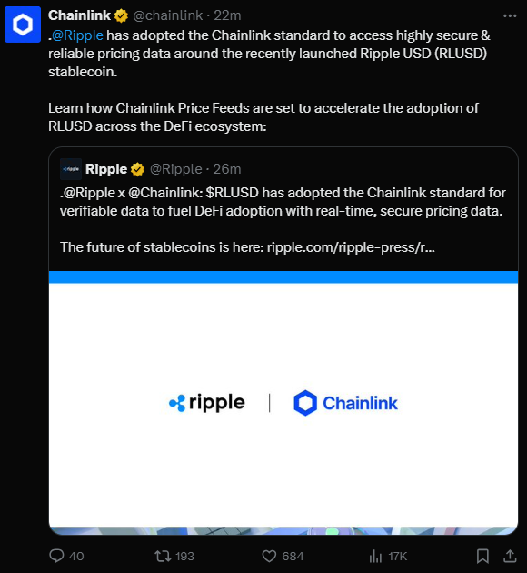 Ripple, RLUSD stablecoin’in geçen ay Ethereum ve XRP Ledger ağları üzerinde kullanıma sundu. Şu anda stablecoin’in toplam piyasa değeri 72 milyon dolar seviyesinde. Chainlink ile iş birliği, RLUSD’nin DeFi alanında hızla benimsenmesine katkı sağlamakta. Ayrıca, özellikle ticaret, borç verme ve düşük maliyetli uluslararası ödemeler gibi birçok farklı finansal uygulamada kullanılmasını amaçlıyor.