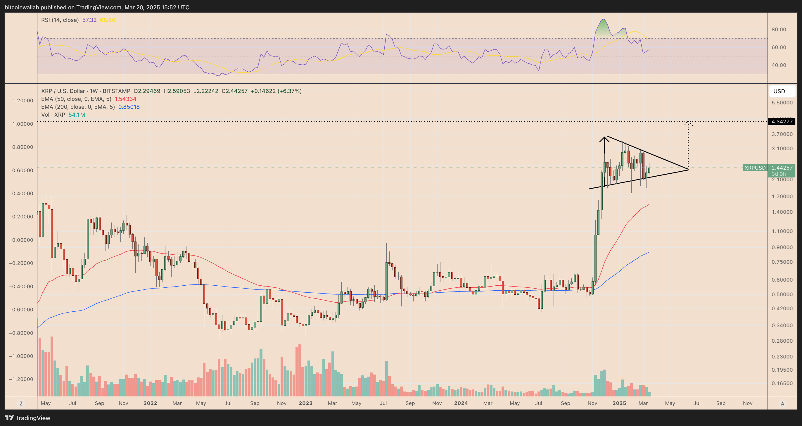 XRP/USD haftalık fiyat grafiği. Kaynak: TradingView21 Mart itibariyle XRP, üçgenin alt trend çizgisini test ettikten sonra sıçrama yaptı ve Nisan ayına kadar üst trend çizgisine doğru bir yükseliş bekliyor. Bu olası kırılma için nihai hedef, mevcut fiyat seviyelerinden %75 artışla Haziran ayına kadar 4,35 dolara ulaşmak.