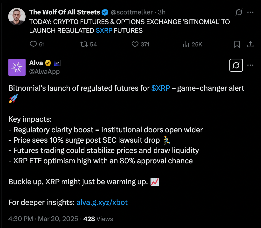 Ralli, kripto borsası Bitnomial’ın ABD’de CFTC tarafından düzenlenen ilk XRP vadeli işlemlerini başlatmadan önce SEC’e karşı açtığı davayı gönüllü olarak reddetmesinin ardından ivme kazandı.