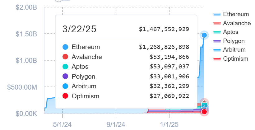 BUIDL, birden fazla blokzincir ağına genişlemiş olsa da, arzın büyük kısmı hâlâ Ethereum üzerinde duruyor. Şu anda fonun %86,46’sına denk gelen 1 milyar dolardan fazlası Ethereum’da bulunuyor. Avalanche ve Aptos gibi ağlar ise yaklaşık 56 milyon dolarlık paylara sahip. Polygon, Arbitrum ve Optimism gibi Ethereum L2 çözümleri de BUIDL token’larına ev sahipliği yapıyor.