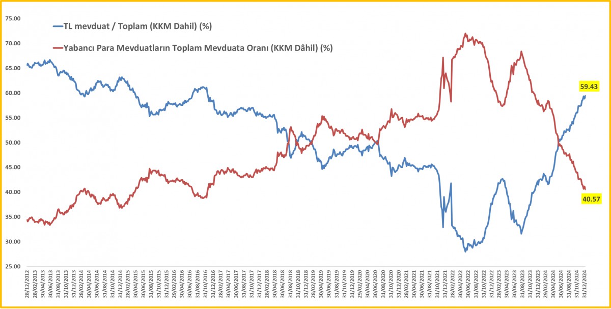 Öte yandan BDDK verisine göre, 15 Ocak ile biten haftada, yabancı para mevduatlar 1 milyar dolar düşüş kaydederek 187,2 milyar dolar seviyesine geriledi. KKM bakiyesi istikrarlı bir şekilde 23 milyar TL daha düşüş kaydederken, USD bazlı ana parası 0,7 milyar dolar düşüşle 30,9 milyar dolar seviyesine geriledi. TCMB’nin KKM’yi 2025 yılında bitirmekte kararlı olduğunun altını bir kez daha çizelim. KKM’nin de bir nevi yabancı para mevduat olduğu düşünülürse, KKM dâhil toplam yabancı para mevduatın toplam mevduat havuzundaki payı %40 seviyesine gerilerken, TL’nin toplam mevduat havuzundaki payı ise %60 seviyesine dayanarak son on yılın zirvesine yükseldi!