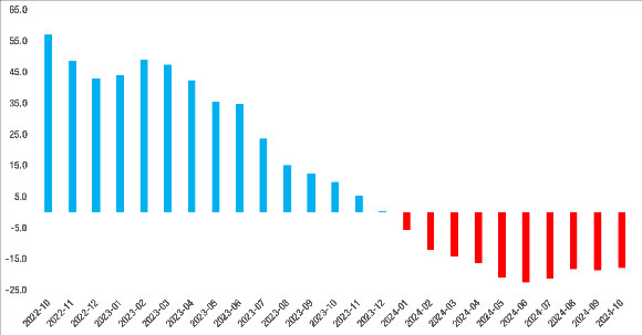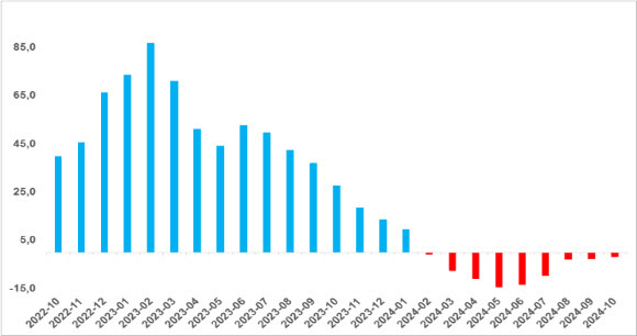 Ağustos 2022’de yüzde 65,8’e ulaşan yıllık reel fiyat artışı Eylül 2022’den itibaren hızla inişe geçmiştir. Büyük depremin etkisiyle Şubat 2023’te geçici olarak yükselen yıllık reel fiyat artışı marttan itibaren yeniden azalmaya başlamış, bu yılın başından itibaren de reel fiyat mutlak olarak azalmaya başlamıştır. Ekim 2024’te yıllık fiyat değişimi oranı Eylül 2024’e kıyasla 0,7 puan artarak yüzde -17,9 ile negatif değerlerde seyrini sürdürmüştür. Bununla birlikte reel fiyatlarda düşüşün haziran ayından itibaren ivme kaybetmekte olduğu dikkat çekmektedir. (Şekil 3)